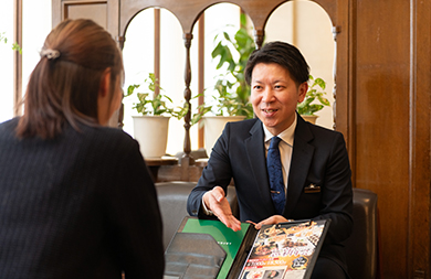 宴会、会議、法要、ウエディングなどに関して、企画趣旨や内容などをお客様と打ち合わせするのが、仕事のメインです。お客様の思いを形にし、ともに特別な時間を創り上げ、思い出に残るひとときをお届けします。